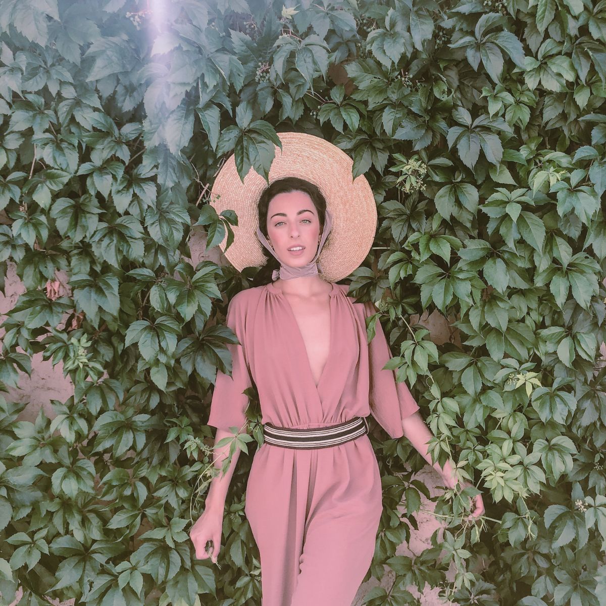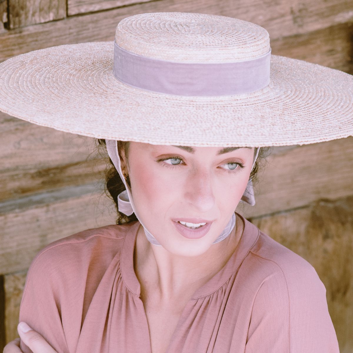 A wide brim natural straw boater finished with soft pink velvet for a romantic yet structured silhouette.