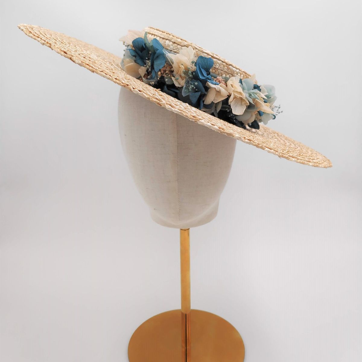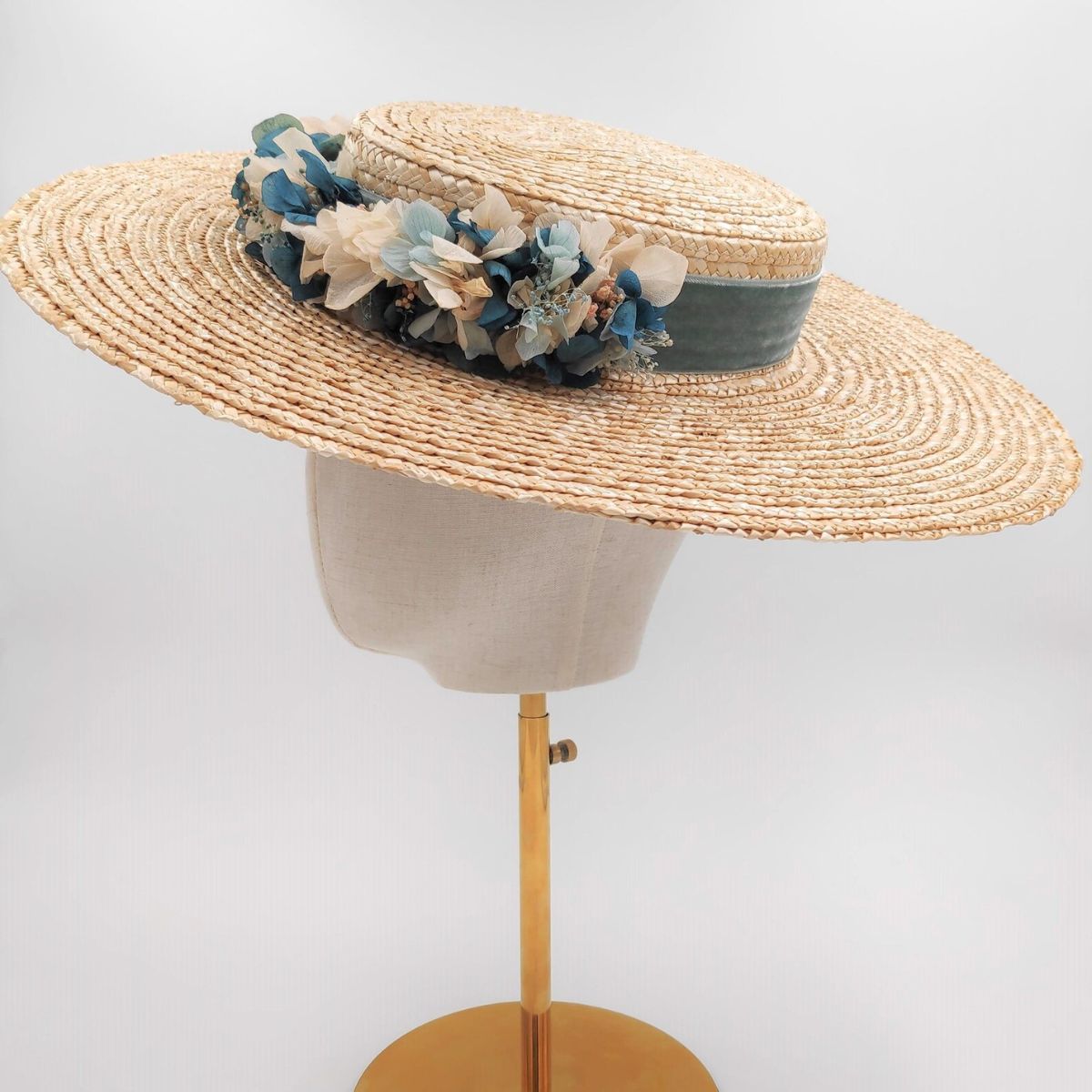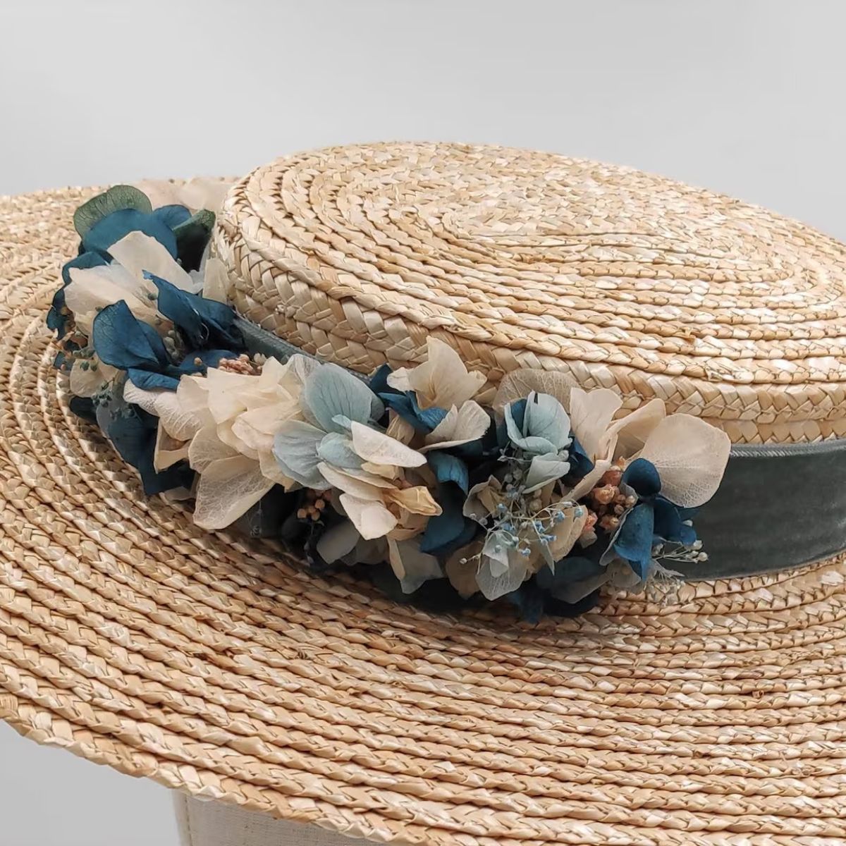 A romantic straw boater hat handcrafted from natural straw and adorned with preserved flowers in soft blue and green tones. Finished with a wide green velvet ribbon, it is an elegant choice for weddings and special occasions.