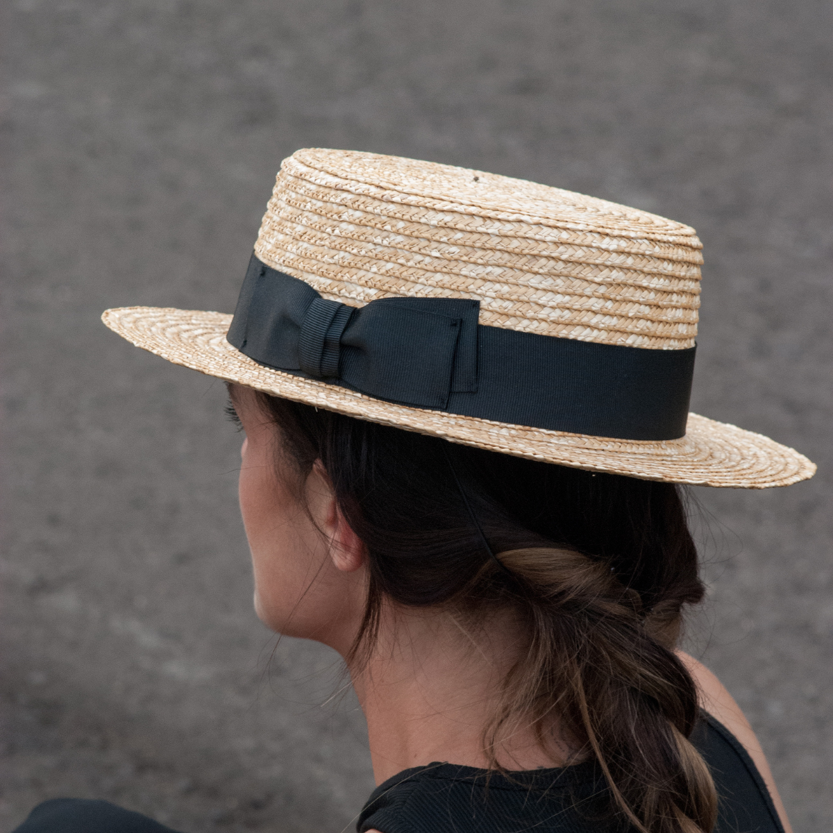 A timeless natural straw boater finished with a black ribbon for effortless elegance.