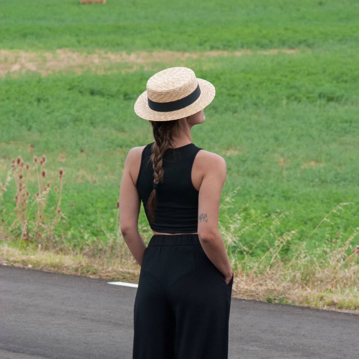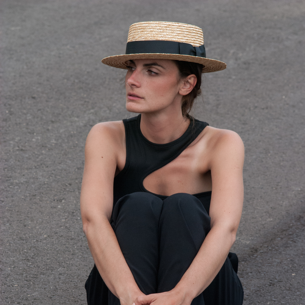 Crafted in natural braided straw, the structured low crown (approx. 5–6 cm) and balanced brim (approx. 30–35 cm diameter) create a flattering architectural shape. The black ribbon adds subtle contrast and classic definition.